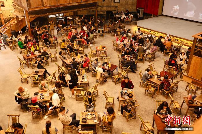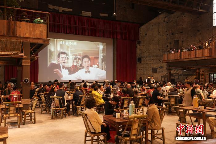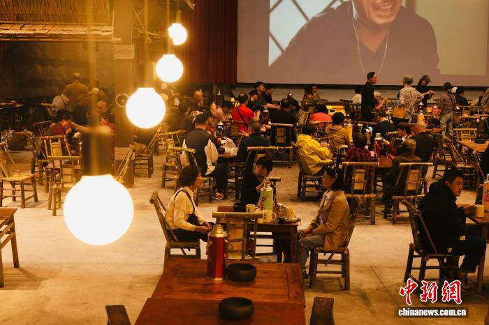 图为市平易近围坐1桌,正在认识的老影院里忙谈品茶。 谭超仄 摄