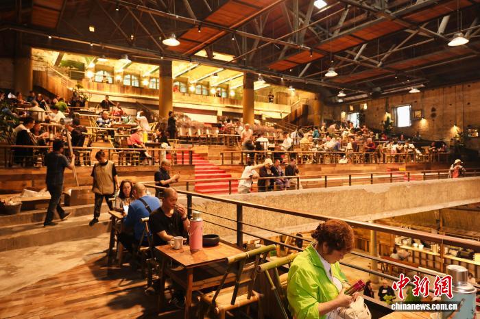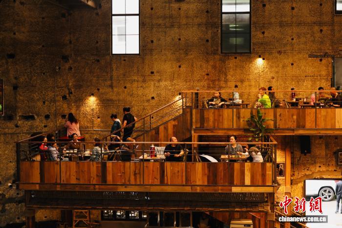 图为茶室哄骗本有厂房的层下上风,配置了停重式卡座取不雅景仄台。 谭超仄 摄