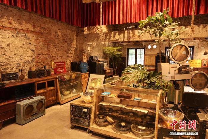 图为茶室摆设区晃搁了老影戏海报、胶片盒取搁映配置,响应着那里曾是员工影院的汗青。 谭超仄 摄